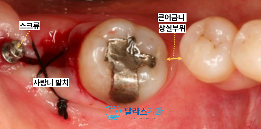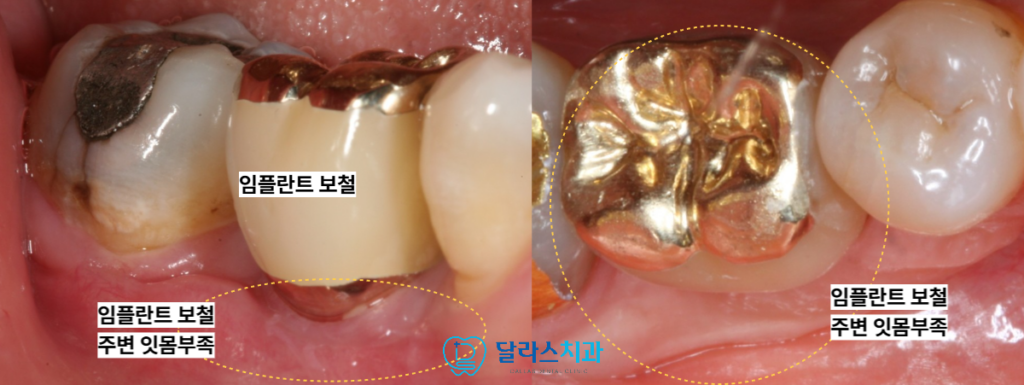 임플란트를 식립한 주변으로 잇몸이 부족하여 밋밋하게 꺼져 있는 것을 볼 수 있는데요.