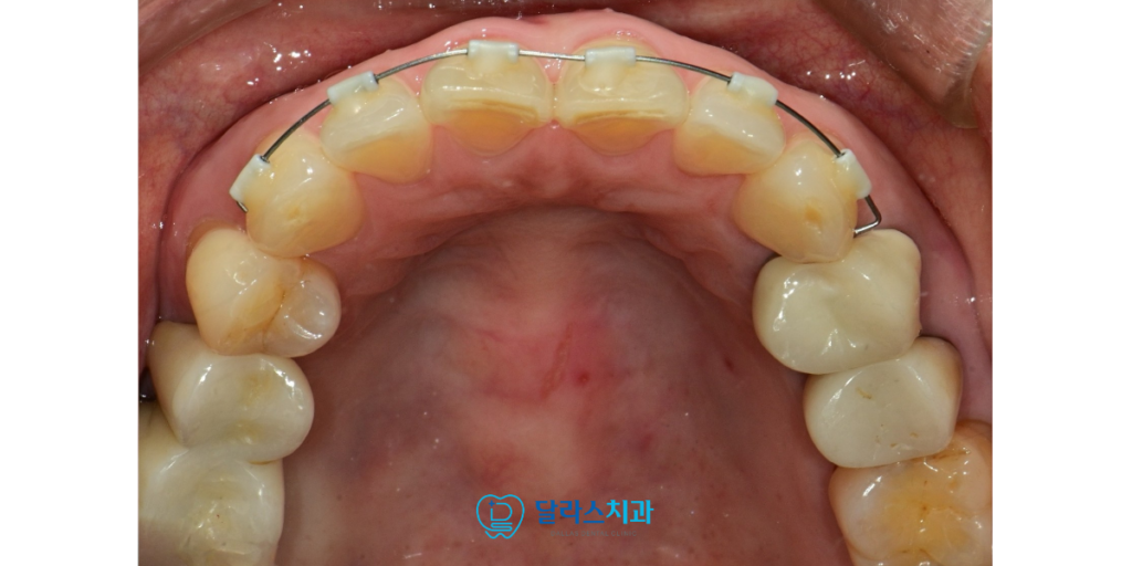 먼저 하악 부위에 교정 장치를 부착하여 겹쳐진 치아들을 가지런히 펴는 작업을 시작하였습니다.
